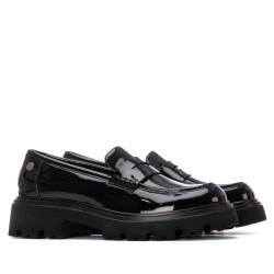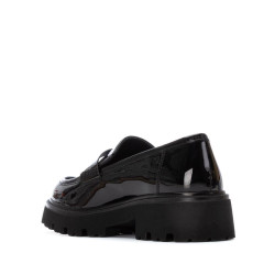 mocasin de mujer de la marca Xti, realizado en charol y con un diseño que incluye troquelado decorativo. Su suela gruesa y dentada antideslizante lo convierte en un esencial básico para tu armario. Con plantilla extraíble. Este modelo ha obtenido el certificado vegano por la organización mundial PETA (Organización de los derechos de los animales).