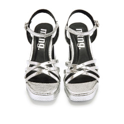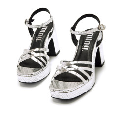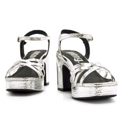 Sandalias de tacón de color plata para mujer, modelo Britt de Mtng. Este diseño combina un acabado metalizado con textura de serpiente, añadiendo un toque llamativo a cualquier look. Cuentan con tiras cruzadas en la parte delantera y una pulsera con hebilla ajustable en el tobillo. Su plataforma y tacón ancho proporcionan comodidad y estabilidad, ideales para eventos especiales o para elevar un outfit casual con un toque de brillo.