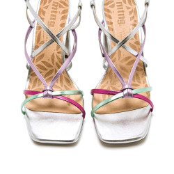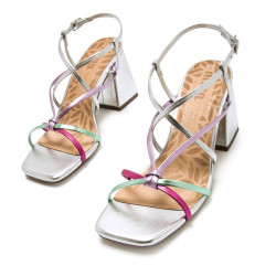 Sandalias de tacón plateadas Marla, para mujer, de Mtng. Estas sandalias destacan por su acabado metalizado y sus tiras finas cruzadas. Con detalles en verde, fucsia y malva, en tono metalizado, crean un contraste elegante y divertido. Cuentan con tacón ancho y cierre de hebilla. ¡Añade un toque de color a tu look con Marla de Mtng!