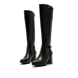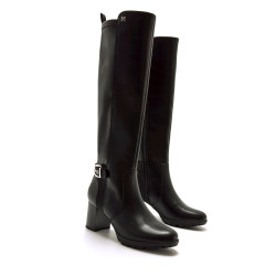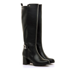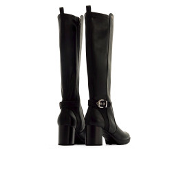 Bota alta de color negro para mujer de Mariamare, modelo Polino de inspiración ecuestre. Con diseño minimalista y detalle de hebilla metálica en el lateral que añade un toque decorativo sutil. Su caña alta estiliza la pierna y el tacón ancho ofrece una pisada estable y cómoda, ideal para el uso diario. El cierre con cremallera lateral facilita el calce. Un modelo versátil que combina con faldas, vestidos o pantalones ajustados para un look funcional y urbano.