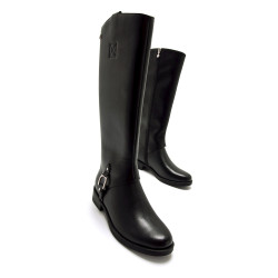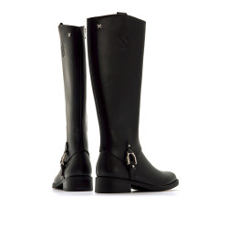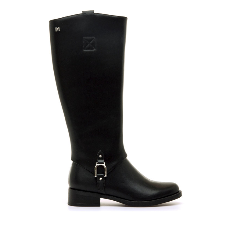 Botas planas negras para mujer de la marca Mariamare, modelo Laglio estilo ecuestre. Este diseño de caña alta incorpora una hebilla metálica lateral que le da un toque distintivo, ideal para looks con personalidad. Su acabado liso y minimalista permite combinarla fácilmente con jeans ajustados o vestidos midi. La suela baja con tacón discreto aporta comodidad para el uso diario, mientras que su estructura firme brinda buen soporte en cada paso. Perfecta para los días fríos en los que buscas practicidad sin renunciar al estilo.