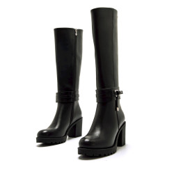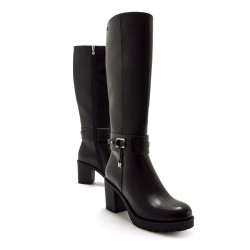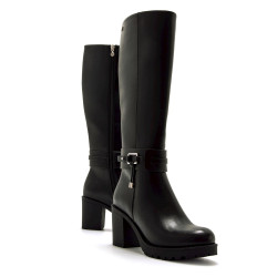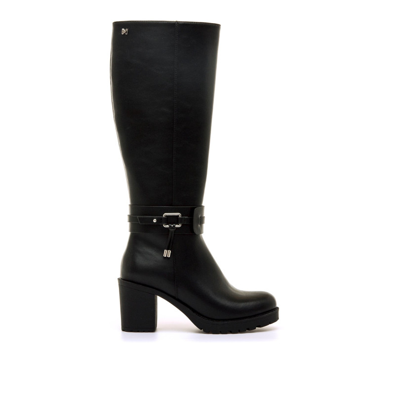 Bota de tacón de color negro para mujer, modelo Pompei de Mariamare con diseño robusto y tacón ancho que ofrece buena estabilidad para el uso diario. Incluye una tira decorativa con hebilla metálica en el tobillo y detalles colgantes que aportan personalidad al conjunto. La caña alta estiliza la pierna, y su suela con ligero relieve mejora el agarre. Ideal para combinar con prendas ajustadas o vestidos, esta bota es una opción versátil para los días fríos.