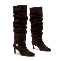 Botas altas de tacón de color moka para mujer, modelo Gala de Mtng, diseñado en colaboración con la influencer Marta Lozano. Su estructura de piel combina un estilo femenino con detalles cuidados, caña arrugada tipo slouchy, puntera afilada y tacón fino de altura media. El cordón fino anudado al tobillo con pieza artesanal dorada añade un toque distintivo y decorativo. Pensada para destacar sin renunciar al confort, esta bota fabricada en España es ideal para elevar cualquier look diario o de fin de semana con un punto de tendencia sutil y atemporal.