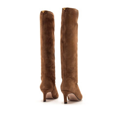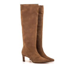 Bota alta de tacón de color marrón para mujer de la marca Mtng, modelo Gala. Su diseño de caña alta y tacón medio aporta una silueta estilizada sin renunciar a la comodidad. El acabado de serraje tono visón la convierte en una opción versátil para combinar con diferentes looks de temporada. El detalle trasero dorado añade un toque funcional sin alterar su estética minimalista. Ideal para ocasiones especiales donde se busca un extra de altura o para elevar cualquier look. Fabricado con piel que proviene de fabricantes aprobados por el protocolo «Leather Working Group», donde evalúan el cumplimiento ambiental y el desempeño, promoviendo prácticas comerciales ambientales sostenibles dentro de la industria del cuero.