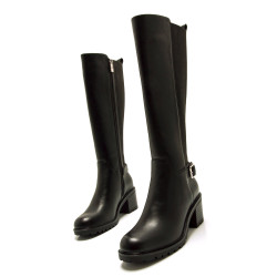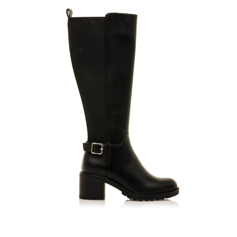 Botas de tacón de color negro para mujer, modelo Maya de Mtng de estilo urbano con inspiración ecuestre. Diseñada con caña alta lisa y elástica en la parte trasera para un mejor ajuste, incluye una hebilla metálica plateada decorativa en el lateral que aporta un toque decorativo. Su tacón ancho junto con la suela con relieve garantizan comodidad y buen agarre. Fabricado con un 60% de algodón reciclado post consumo y un 40% de algodón convencional. Ideal para looks de invierno que buscan practicidad sin perder estilo.