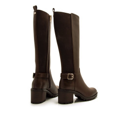 Bota alta de color moka para mujer de la marca MTNG, modelo Maya de estilo urbano con toques ecuestres. Cuenta con caña elástica en la parte trasera que favorece el ajuste a la pierna, mientras que la hebilla metálica lateral añade un detalle funcional y decorativo. Su diseño incorpora cremallera interior para facilitar el calce, suela dentada y tacón ancho medio para mayor estabilidad, ideal para el uso diario en días fríos. Fabricado con un 60% de algodón reciclado post consumo y un 40% de algodón convencional.