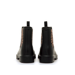 Botines de agua planos de color negro para mujer, modelo Halo de Mtng. Este diseño tipo chelsea incorpora paneles laterales elásticos con estampado de leopardo, que aportan un toque llamativo y actual. Su suela con relieve lo convierte en una opción cómoda para el uso diario. Ideal para combinar con jeans o prendas básicas, este botín es perfecto para dar un aire diferente a looks de entretiempo o días lluviosos.