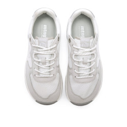 Zapatillas para mujer modelo Free Apolo de la marca Mtng de color blanco. Presenta una combinación de texturas con piezas en beige claro, detalles en lila y azul suave, y refuerzo trasero con acabado iridiscente. El diseño incorpora cierre con cordones y logo lateral en contraste. Diseñadas y desarrolladas especialmente en colaboración con el Dr. Juanjo López, traumatólogo deportivo, para respetar el desarrollo natural del pie. Se trata de un calzado minimalista que gracias a su puntera ancha, suela totalmente plana (cero drop) y flexibilidad, mejora la anatomía del pie y favorece una mejor posición del mismo. Se vende con una plantilla de transición para hacer el cambio de calzado convencional a minimalista de manera progresiva. Con certificado VEGANO sellado por INESCOP, el cual garantiza que la naturaleza química principal del material no se corresponde con fibras de origen animal.