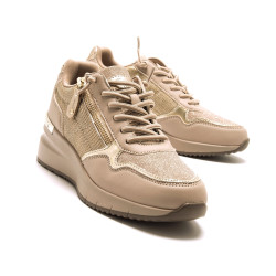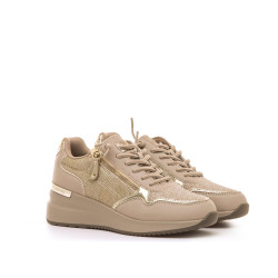 Zapatillas de cuña color arena para mujer, modelo Goa de mtng. Un diseño con combinación de texturas, cierre con cordones y cremallera lateral decorativa que le aporta un detalle diferenciador. Incorpora piezas metalizadas doradas que añaden un acabado llamativo sin perder versatilidad. Ideal para looks urbanos donde se busca comodidad con un toque actual, gracias a su suela con volumen que estiliza sin renunciar a la funcionalidad. Incorporan una plantilla de 4 mm con tecnología Starfit, estas zapatillas ofrecen una pisada suave y cómoda. Su espuma Comfort Foam aporta un acolchado extra, ideal para disfrutar de un confort prolongado en cada uso.