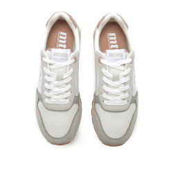 Zapatillas casual de color blanco con detalles en beige y gris para mujer de la marca Mtng, modelo Joggo Classic, de estilo retro running. Este diseño combina diferentes tejidos y tonos neutros con un toque rosa empolvado en el talón, refuerzo azul celeste y suela dentada de color caramelo. Incluye cierre con cordones, logo lateral bordado y plantillas con tecnología Starfit, que mejoran la comodidad en cada paso. Con certificado VEGANO sellado por INESCOP, el cual garantiza que la naturaleza química principal del material no se corresponde con fibras de origen animal.