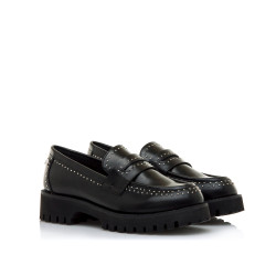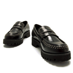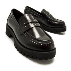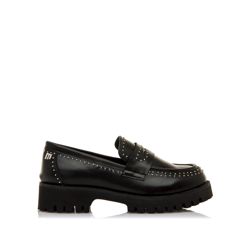 Mocasines negros para mujer de Mtng, modelo Lenox de estilo casual con suela gruesa tipo track que aporta un extra de altura y comodidad. Su diseño combina acabado brillante con pequeñas tachas metálicas distribuidas por el contorno, añadiendo un toque moderno sin perder su versatilidad. Perfecto para combinar con looks urbanos o de oficina, este mocasín ofrece una alternativa cómoda y actual para el uso diario.