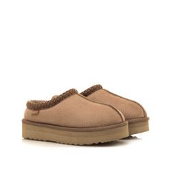Zuecos de pelo de color taupe para mujer de la marca MTNG, modelo Nivia. Su diseño cerrado tipo slip-on incorpora una suela gruesa con relieve que mejora el agarre y el confort en el uso diario. El ribete decorativo con patrón étnico y la costura central a lo largo del empeine aportan un detalle distintivo al conjunto, mientras que el interior de pelo favorece la sensación de abrigo. Ideal para estar cómoda tanto dentro como fuera de casa en los días fríos.