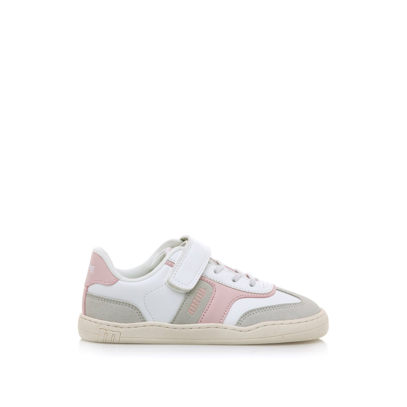 Zapatillas blancas con detalles en rosa claro y gris para niña, modelo Free de Mtng. Este diseño combina un estilo actual con la máxima comodidad, ideal para acompañar las actividades diarias. Presenta cierre adhesivo y cordones elásticos que facilitan un ajuste rápido y seguro. Diseñado y desarrollado especialmente en colaboración con el Dr. Juanjo López, traumatólogo deportivo e infantil, para respetar el desarrollo natural del pie del niño y la niña. Gracias a su puntera ancha permite el libre movimiento de los dedos dentro del zapato. Las plantillas extraíbles facilitan comprobar si la talla del calzado es la correcta para tu hijo. Además, su fácil apertura facilita que el niño pueda descalzarse y calzarse de forma autónoma. Con certificado VEGANO sellado por INESCOP, el cual garantiza que la naturaleza química principal del material no se corresponde con fibras de origen animal.