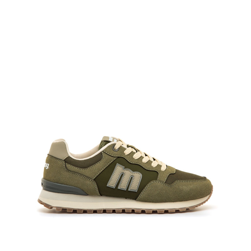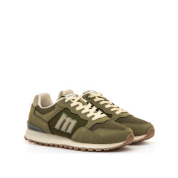 Zapatillas de color verde kaki para hombre, modelo Joggo Track de la marca Mtng, de estilo retro con inspiración deportiva. Incorpora una combinación de paneles en distintos tonos de verde, con el logo lateral en beige y una suela dentada de goma marrón que mejora el agarre. Los cordones beige y las plantillas con tecnología Starfit, mejoran la comodidad en cada paso. Con certificado VEGANO sellado por INESCOP, el cual garantiza que la naturaleza química principal del material no se corresponde con fibras de origen animal.