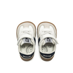 Zapatillas deportivas de color blanco para bebé de la marca Mtng, modelo Free Baby, con detalles en marino y estilo casual inspirado en las sneakers clásicas. Combinan paneles lisos y textura tipo serraje en gris, y cuentan con cierre adherente junto a cordones elásticos que mejoran el ajuste y la comodidad. La suela en color caramelo contrasta con el corte superior y aporta un toque actual al diseño. Con certificado VEGANO sellado por INESCOP, el cual garantiza que la naturaleza química principal del material no se corresponde con fibras de origen animal. Diseñada y desarrollada especialmente en colaboración con el Dr. Juanjo López, traumatólogo deportivo e infantil, para respetar el desarrollo natural del pie de los niños. Gracias a su puntera ancha permite el libre movimiento de los dedos dentro del zapato. Su suela tiene 3 mm de grosor y con zero drop (totalmente plana) respeta el natural desarrollo del pie del pequeño y sus elementos flexibles y torsionables hace que el pie del niño no esté encorsetado por la estructura del zapato. Las plantillas extraíbles facilitan comprobar si la talla del calzado es la correcta para tu hijo. Además, su fácil apertura facilita que el niño pueda descalzarse y calzarse de forma autónoma. Acompaña los primeros pasos de tu bebé con mtng.