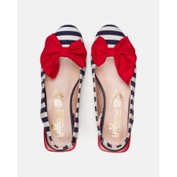 Bailarina plana de rayas azul marino con detalles rojos, diseñado con lazo frontal que te hará sentir femenina con cualquier look ¡No pasarás desapercibida! Cuenta con una suela de 1,5 cm. Mediante un agarre elástico por la parte trasera del tobillo facilitamos el ajuste al pie de forma que iras cómoda a todos lados. Corte exterior de rayas de tejido textil. Plantilla de piel vacuna acolchada y antideslizante que añade un extra de comodidad. Elaborada en España mediante un proceso de fabricación artesanal que usa tintes vegetales y embalajes sostenibles para respetar el medio ambiente.