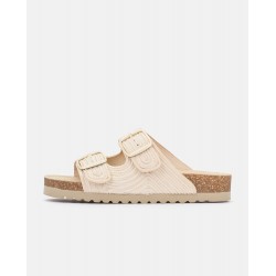 La innovadora sandalia NOJA 002 en blanco, con una hebilla en cada una de las correas que conforman su llamativo diseño y una textura peculiar, conseguida mediante un conjunto de hilos hechos a mano. Es de fácil calce y una muy buena sujeción. Cuenta con una suela de 3,5 cm y una plantilla antideslizante que garantiza el agarre del pie. Está elaborada de manera artesanal en España, material de piel y uso de tintes vegetales respetuosos con el medio ambiente.