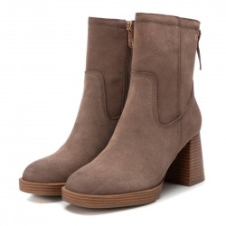 Botín de mujer, de la marca Carmela. Fabricado en serraje de alta calidad. Cierre mediante cremallera trasera. Tacón ancho de 8 cm y plataforma para mayor comodidad. Suela antideslizante.