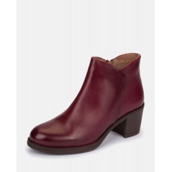 Bota LILLE 006 de color burdeos con un tacón de 6 cm con corte exterior de piel vacuna lisa, e interior de piel porcina y textil, diseño distinto por su corte en media cascada, resaltando el centro del tobillo. Fabricada en España. Diseño minimalista . Gran flexibilidad. Plantilla acolchada y antideslizante que añade un extra de comodidad. Elaborada mediante un proceso de fabricación artesanal que usa tintes vegetales y embalajes sostenibles para respetar el medio ambiente.