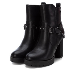 Botín de mujer, de la marca Refresh. Fabricado en un material que imita la piel. Cierre cremallera en el lateral. Correa decorativas con elementos metálicos. Tirador trasero para facilitar la puesta. Este modelo ha obtenido el certificado vegano por la organización mundial PETA (Organización de los derechos de los animales).