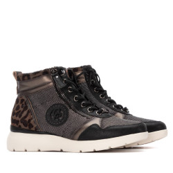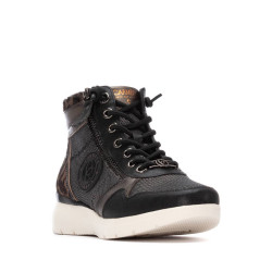 Botín de mujer, de la marca Carmela. Fabricado en piel de alta calidad. Cierre lateral con cremallera y cordones. Detalles laterales con efecto metalizado. Tirador trasero para facilitar la puesta. Suela antideslizante. Plantilla extraíble.