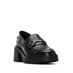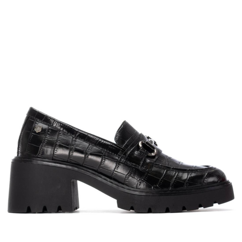 mocasin de mujer, de la marca Carmela. Fabricado con material sintético que imita la piel con bonito grabado en coco. Antifaz en el frente con cadena decorativa. Suela de goma antideslizante. Plantilla extraíble
