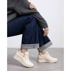 Zapatilla de mujer, de la marca Refresh. Fabricada en material que imita a la piel con detalles en estampado de serpiente. Cierre mediante cremallera lateral. Cordones elásticos al tono. Una zapatilla con cuña ideal para todos los planes de esta temporada. Con plantilla extraíble. Este modelo ha obtenido el certificado vegano por la organización mundial PETA (Organización de los derechos de los animales).
