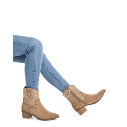 Botín de mujer, de la marca Xti. Fabricado en antelina, con un toque de brillos en la parte superior, que le da un aire sofisticado y llamativo. Su diseño de estilo cowboy presenta una punta ligeramente alargada y detalles que evocan ese estilo tan característico. Con un tacón bajo de 7 cm, proporciona comodidad y estabilidad, ideal para el día a día sin perder el toque de elegancia. Perfecto para combinar con jeans, faldas o vestidos, y con la suela antideslizante que asegura un paso firme en cualquier superficie. Plantilla extraíble.