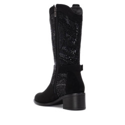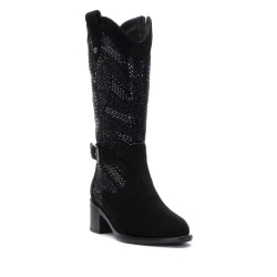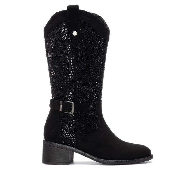 Bota de mujer de antelina, de la marca Xti. Con un elegante diseño de corte estilo cowboy, esta bota cuenta con brillantes al tono que aportan un toque de glamour y sofisticación. Su tacón de 6 cm proporciona la altura ideal para un look cómodo y estilizado. La hebilla decorativa en el lateral añade un detalle moderno y original, mientras que su suela antideslizante garantiza seguridad al caminar. Perfecta para quienes buscan un calzado con personalidad y estilo.