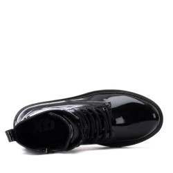 Botín de mujer estilo militar de la marca Xti, fabricado en material de charol, que le da un toque brillante y moderno. Cuenta con una cremallera interior para facilitar la puesta, brindando comodidad y rapidez al calzarse. Ideal para un look audaz y urbano con un toque de distinción. Este modelo ha obtenido el certificado vegano por la organización mundial PETA (Organización de los derechos de los animales).