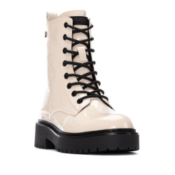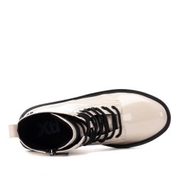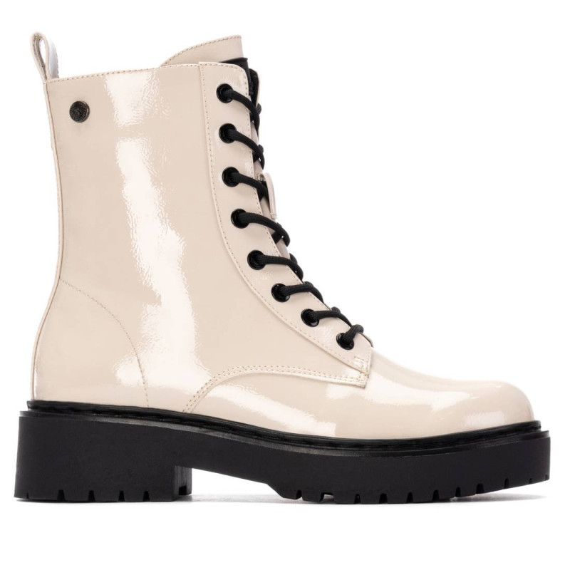 Botín de mujer estilo militar de la marca Xti, fabricado en material de charol, que le da un toque brillante y moderno. Cuenta con una cremallera interior para facilitar la puesta, brindando comodidad y rapidez al calzarse. Ideal para un look audaz y urbano con un toque de distinción. Este modelo ha obtenido el certificado vegano por la organización mundial PETA (Organización de los derechos de los animales).