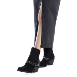 Botín de mujer, de la marca Xti. Fabricado en suave antelina, con un diseño elegante que incluye un faldón que aporta un toque sofisticado y fluido. Este modelo está decorado con brillantes en los bordes, añadiendo un brillo delicado y moderno al diseño. La suela estilo cowboy le da un aire atrevido y actual, mientras que el tacón ancho de 7 cm proporciona estabilidad y comodidad en cada paso. Ideal para quienes buscan un Botín único que combine estilo, confort y un toque de distinción. Perfecto para destacar en cualquier ocasión. Con plantilla extraíble. Este modelo ha obtenido el certificado vegano por la organización mundial PETA (Organización de los derechos de los animales).
