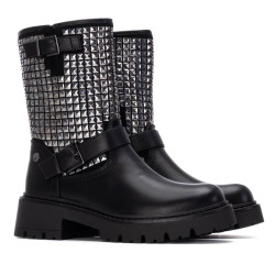 Botín de mujer, de la marca Xti. Fabricado en material que imita la piel, con un diseño moderno y atrevido. Este modelo cuenta con tachas decorativas que le dan un toque de estilo rockero, mientras que las hebillas laterales aportan un detalle elegante y distintivo. La cremallera interior facilita la puesta y el ajuste, ofreciendo mayor comodidad y practicidad. Ideal para quienes buscan un Botín versátil y con carácter, que combine bien con looks casuales y más sofisticados. Además, su suela antideslizante garantiza estabilidad y confort en cada paso.Con plantilla extraíble. Este modelo ha obtenido el certificado vegano por la organización mundial PETA (Organización de los derechos de los animales).