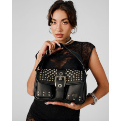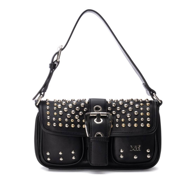 Bolso de mujer de la marca XTI. Fabricado en material que imita la piel, con diseño compacto y detalles de tachas metálicas que aportan un toque moderno y atrevido. Ideal para llevar lo justo con estilo. Incluye asa de hombro. Cierre mediante clip. Medidas: 18 x 28 x 5 cm. Este modelo ha obtenido el certificado vegano por la organización mundial PETA (Organización de los derechos de los animales).