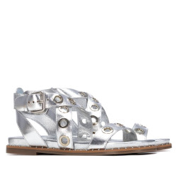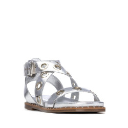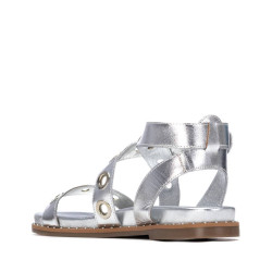 Sandalia de mujer, marca Carmela. Fabricada en piel de alta calidad. Modelo estilo romana con anillas metálicas decorativas para crear un mayor estilo y elegancia. Cómoda planta y suela antideslizante.