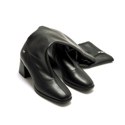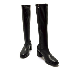 Botas altas de color negro para mujer de Mariamare, modelo Nerola. Su acabado liso y ajustado a la pierna estiliza la figura, mientras que el tacón cuadrado aporta estabilidad y comodidad. El detalle del logo metálico en la parte superior añade un toque sutil. Perfectas para combinar con vestidos, faldas o pantalones ajustados, convirtiéndose en un básico imprescindible para los días fríos.