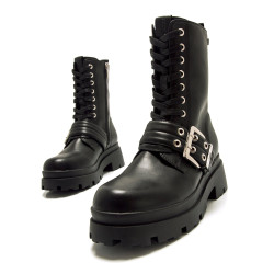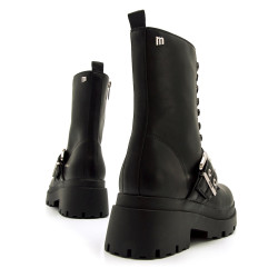 Botines negros para mujer de la marca Mtng, modelo Missione. Estos botines destacan por su diseño que combina un estilo biker y militar con detalles de hebillas metálicas y cordones, que aportan un toque atrevido. La suela gruesa con relieve ofrece un excelente agarre, mientras que la cremallera lateral asegura comodidad al ponerlos. Ideales para looks urbanos y desenfadados.