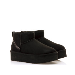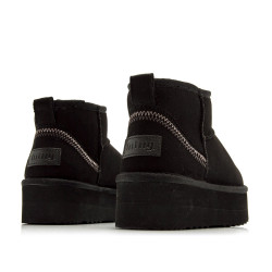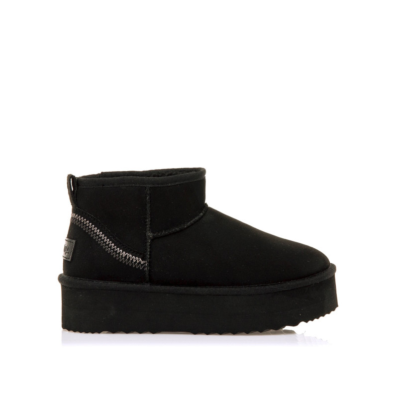 Botín de color negro para mujer modelo Nivia de Mtng, de estilo australiano con plataforma y caña baja. Su interior forrado ofrece una sensación cálida ideal para el invierno, mientras que la suela elevada proporciona mayor aislamiento y un plus de comodidad. Incluye detalle decorativo de costura en zigzag en contraste en el talón y tirador trasero para facilitar el calce. Perfecto para looks relajados sin renunciar al confort.