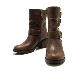 Botín de color cuero para mujer de la marca MTNG, modelo Persea de estilo biker. Con una caña baja arrugada y decorado con dos hebillas metálicas doradas en la parte superior y otra al tobillo, este diseño ofrece un look robusto y funcional. El tacón ancho proporciona una base estable y cómoda para el uso diario, mientras que la cremallera lateral permite un calce práctico. Ideal para dar un aire informal con carácter a tus conjuntos de temporada.