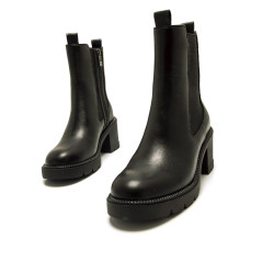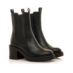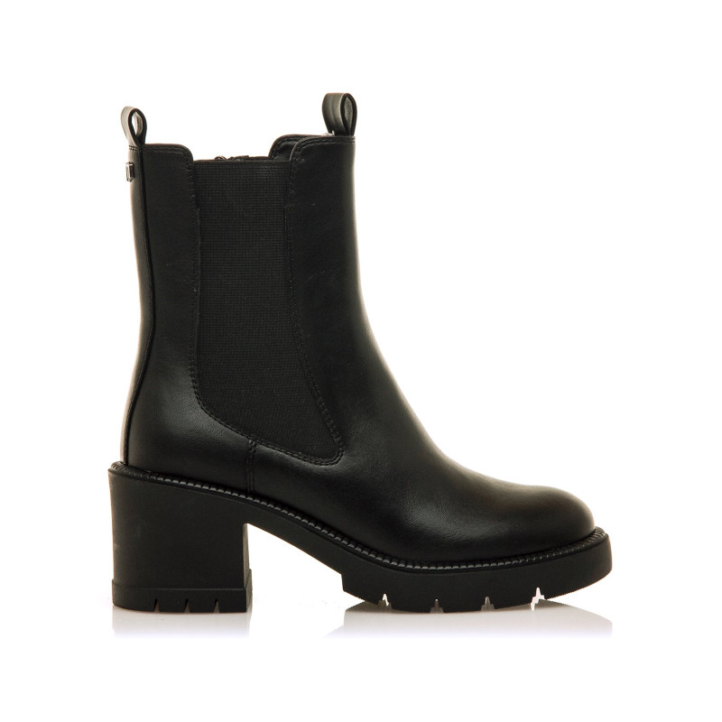 Botines negros para mujer, modelo Praga de la marca Mtng. Este diseño clásico combina paneles elásticos laterales y un práctico cierre con cremallera, garantizando un ajuste cómodo y rápido. Su tacón ancho de altura media y suela dentada ofrecen estabilidad y un toque moderno. Ideales para complementar cualquier estilo, estos botines se convertirán en un imprescindible en tu armario.