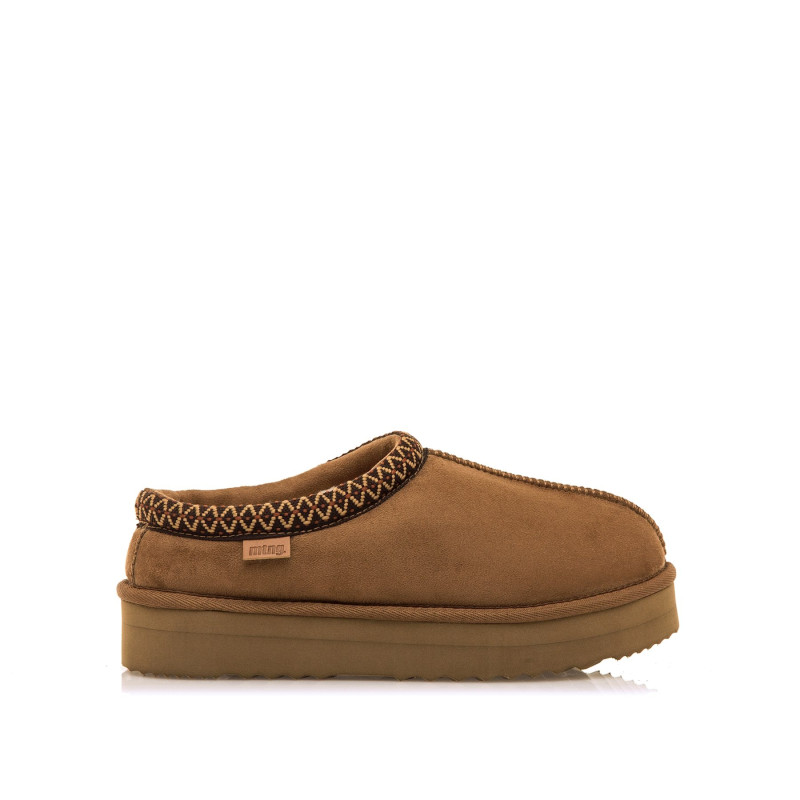 Zueco de color camel para mujer de la marca Mtng, modelo Nivia, con diseño tipo slipper cerrado y suela elevada. Este modelo destaca por su ribete en contraste con dibujo étnico que rodea la abertura y su costura visible a lo largo del empeine. La suela gruesa con acabado dentado mejora la tracción y el confort, ideal para el uso diario dentro o fuera de casa. Un calzado versátil con interior tipo pelo para los días fríos.