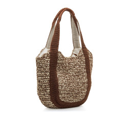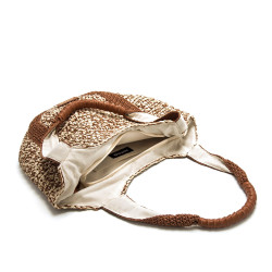 Bolso tipo hobo de color beige con detalles marrones para mujer, modelo Mar de Mtng diseñado con un acabado trenzado. Su formato curvado y ligero de rafia lo hace cómodo de llevar, adaptándose fácilmente al hombro. Dispone de asas anchas de macramé que ofrecen un buen apoyo, y un interior forrado con cierre de cremallera, ideal para guardar tus objetos personales con mayor seguridad. El logo frontal añade un detalle reconocible que completa un diseño fácil de combinar.