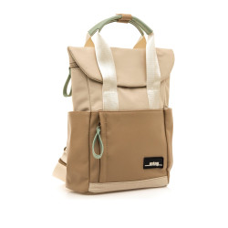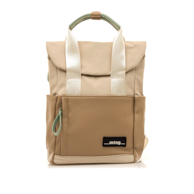 Mochila de color beige para mujer de la marca Mtng, modelo Nube de estilo casual con diseño práctico y actual. Combina tonos beige claro y camel con detalles en verde menta en los tiradores y el asa superior, aportando un contraste sutil. Cuenta con doble cierre mediante cremallera y solapa con botón magnético, lo que brinda mayor seguridad. Incluye asas de mano, tirantes ajustables en color crudo y bolsillos laterales y frontales para un acceso rápido. El interior está forrado y ofrece gran capacidad de organización. Una mochila funcional y ligera, ideal para acompañar un estilo relajado.