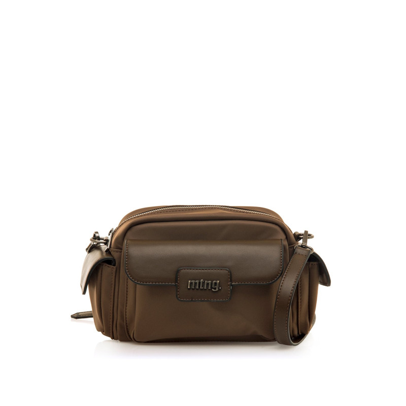 Bolso de color moka para mujer de la marca mtng, modelo Pasha tipo bandolera. Este diseño compacto con múltiples bolsillos exteriores con solapa combina funcionalidad y estilo en el día a día. Incorpora una correa regulable que permite llevarlo cómodamente cruzado o al hombro, y su cierre principal de cremallera asegura mayor practicidad. Su combinación de texturas tipo cuero y tipo nylon aportan un aspecto moderno y urbano. Perfecto para quienes buscan un bolso cómodo y con compartimentos para organizar objetos personales.