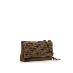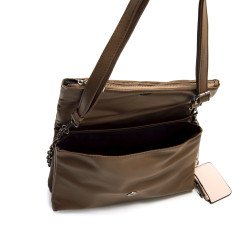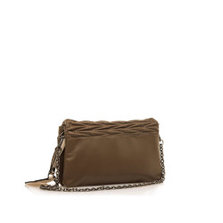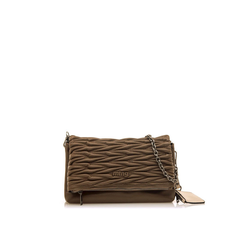 Bolso bandolera de color taupe para mujer de la marca Mtng, modelo Pema. Destaca por su textura acolchada con diseño en relieve que aporta un efecto visual atractivo y diferenciador. Incorpora una cadena metálica para llevar al hombro y un monedero mini en contraste de color crema. El cierre superior con solapa y cremallera garantiza seguridad, mientras que su tamaño compacto lo convierte en la opción ideal para planes urbanos o salidas informales.