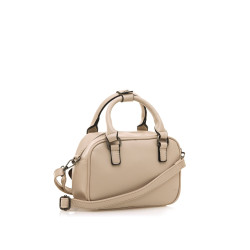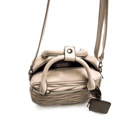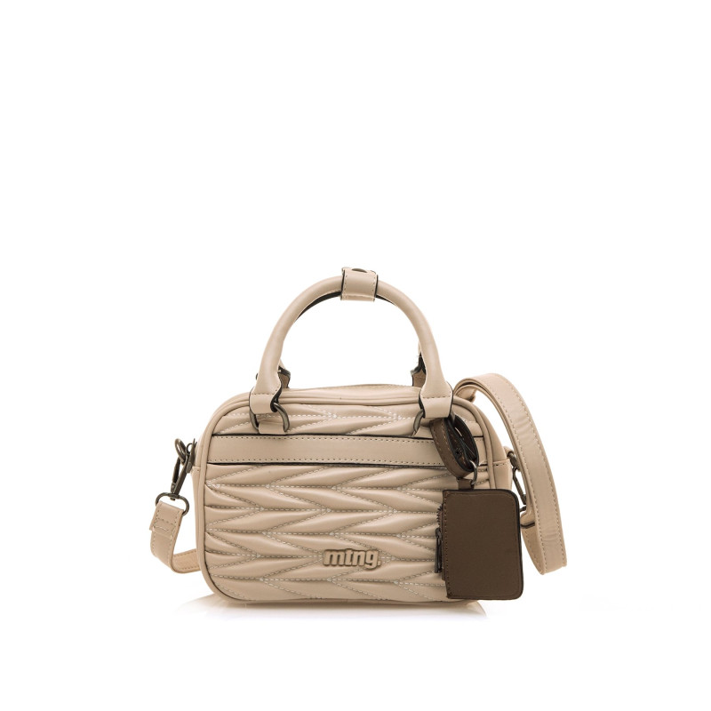 Bolso tipo bowling de color crema para mujer, modelo Piper de la marca Mtng. Presenta un diseño acolchado con costuras en patrón geométrico que aporta textura y originalidad. Incorpora doble asa de mano, bandolera ajustable y un charm monedero en contraste de color taupe. Su tamaño compacto lo convierte en una opción cómoda y versátil para el uso diario, combinando funcionalidad con un diseño actual que se adapta a distintos estilos.