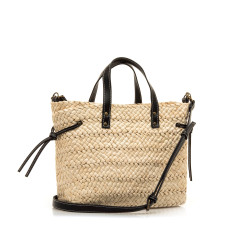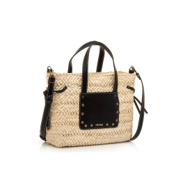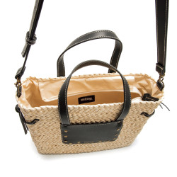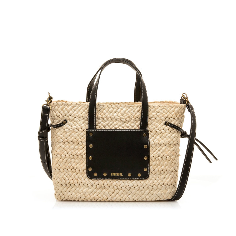 Bolso estilo shopper de color vainilla con detalles negros para mujer, modelo Pozo de la marca Mtng, tipo capazo. Diseñado en maíz natural y con acabado trenzado, aporta un aire artesanal que contrasta con las asas de mano, bandolera y bolsillo frontal de color negro. Cuenta con detalles de nudos en los laterales y tachas doradas en el frontal. Con cierre superior de cremallera y bolsillo interior organizador. Ideal para llevar lo esencial con un estilo relajado y veraniego.
