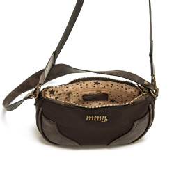 Bolso bandolera de color moka de la marca Mtng, modelo Siara para mujer. Presenta una silueta compacta con diseño curvado y detalles en ante sintético que aportan contraste. Incluye dos asas intercambiables, una corta para llevar al hombro y otra larga ajustable tipo webbing para mayor versatilidad. El logo metálico mtng en color dorado destaca sobre el frontal, añadiendo un toque distintivo. Ideal para completar looks casuales con un accesorio práctico y con personalidad.