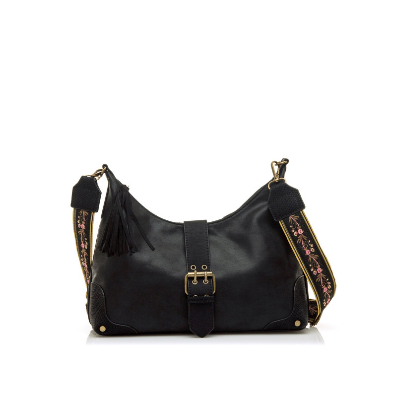 Bolso hobo negro para mujer de mtng, modelo Soco. Este diseño de estilo boho casual destaca por su correa ancha con bordado floral y detalles metálicos dorados que realzan su carácter artesanal. Incorpora flecos decorativos en el cierre de cremallera y una hebilla central sobre una tira de cierre magnético, aportando un extra de personalidad. Cuenta con un interior amplio, perfecto para el día a día sin perder el toque diferenciador que lo hace único.