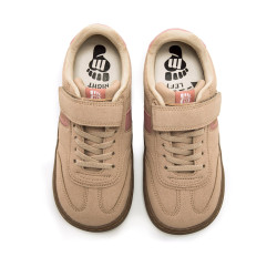 Zapatillas de color crudo para niña, modelo Free de mtng. Este modelo con detalles en rosa en el lateral y el talón ofrece una combinación funcional y estética para el día a día. Su diseño con cierre adhesivo y cordones elásticos facilita un ajuste rápido y cómodo. Diseñado y desarrollado especialmente en colaboración con el Dr. Juanjo López, traumatólogo deportivo e infantil, para respetar el desarrollo natural del pie del niño y la niña. Gracias a su puntera ancha permite el libre movimiento de los dedos dentro del zapato. Las plantillas extraíbles facilitan comprobar si la talla del calzado es la correcta para tu hijo. Además, su fácil apertura facilita que el niño pueda descalzarse y calzarse de forma autónoma. Con certificado VEGANO sellado por INESCOP, el cual garantiza que la naturaleza química principal del material no se corresponde con fibras de origen animal.